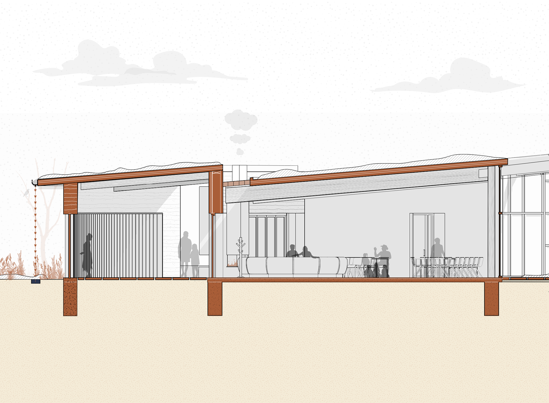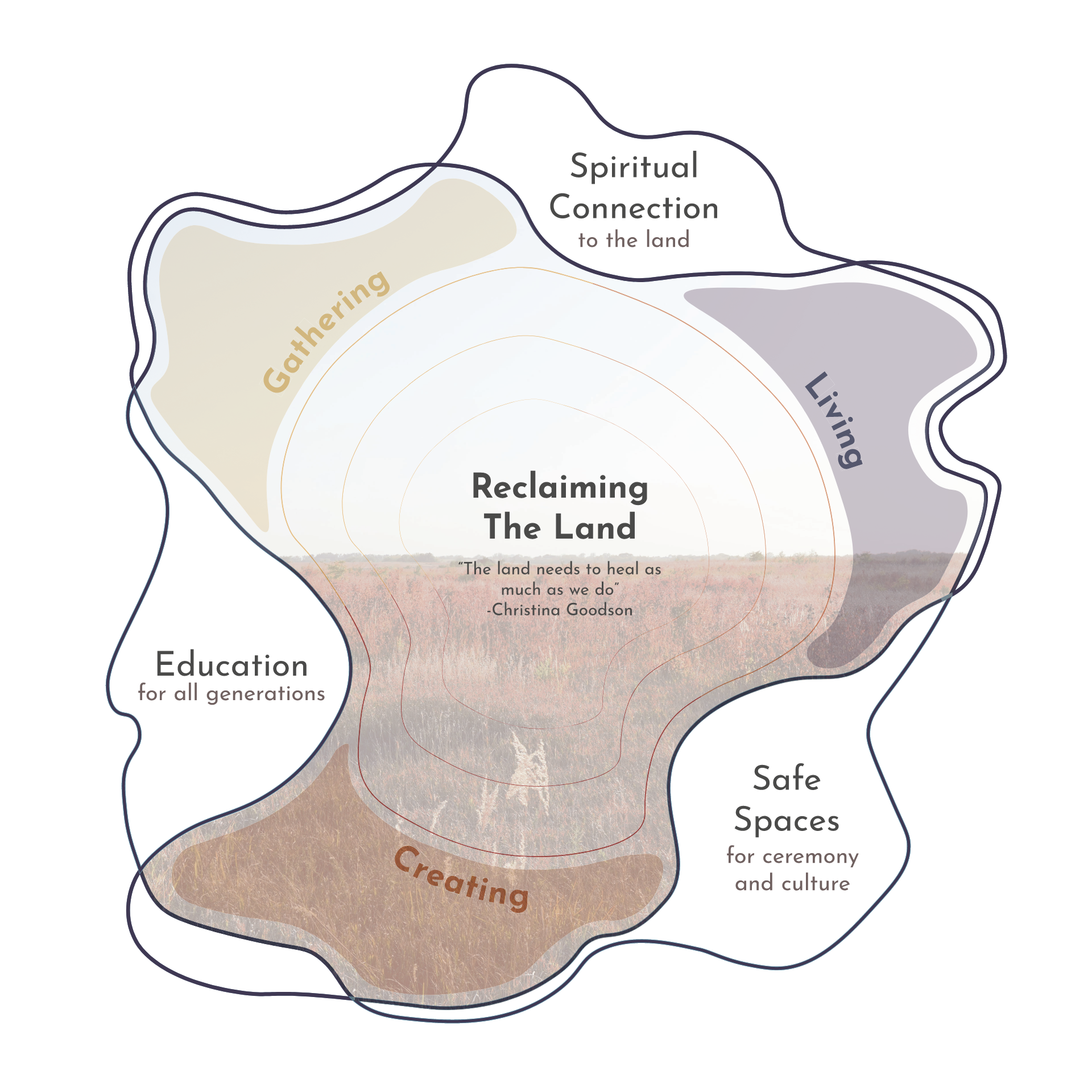 Over the course of this project, we worked closely with tribal partners to design architectural interventions that work to reconnect the tribe to their native lands and bring awareness of there presence to the public. Regrowing Roots is located on Spring Creek Audubon Prairie and aims to create a space where tribe members can reclaim active stewardship of their land and practice and teach their culture. The site includes spaces for artistic practices, traditional gathering and storytelling, and the growing and cooking of food, as well as housing for visiting tribe members.